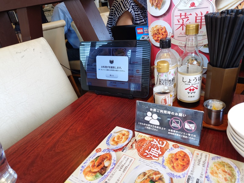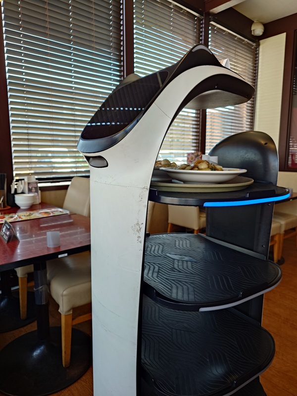 まず入店。時間帯的に空いていたこともあって、勝手に空いている席へ。タッチパネルで注文を済ませると、息子と会話している間に画面が“お料理が到着いたします”の表示に変わり、やがて――登場!配膳ロボット。まるで近未来映画のワンシーン。ロボットから料理を受け取り、「完了」ボタンを押すと静かに去って行きました。うーん、働き者。