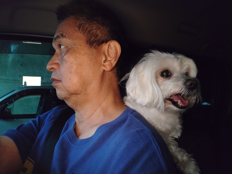 雨の日はというと、彼は濡れるのを極端に嫌うので、車で「新湘南バイパス」の高架下へ移動。雨風をしのぎながら散歩します。送り迎えの車内では、私の肩に勝手に乗ってきて、頼みもしないのに耳元で「ハアハア」。さらに頼みもしないのに、舌の届く範囲をペロペロ舐めてくれるというサービス付き。(しつこいですが、頼みもしないのに・・・笑)