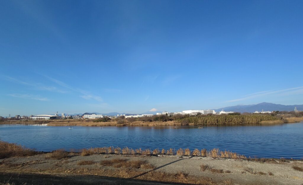 ぽぽまる君と一緒に相模川河畔を歩きます。